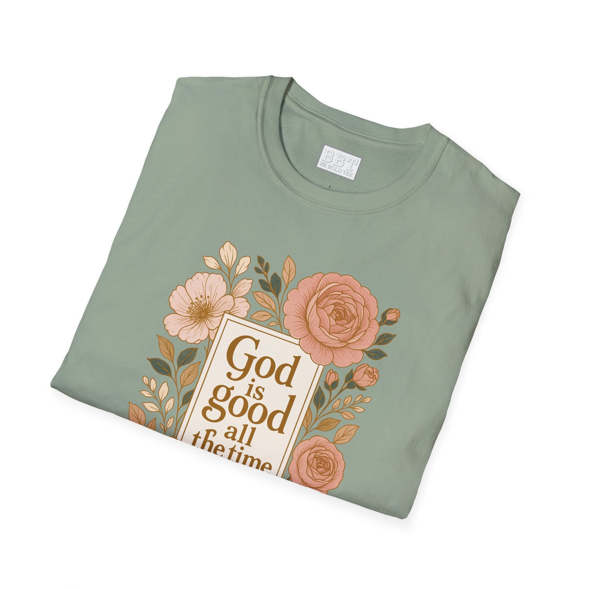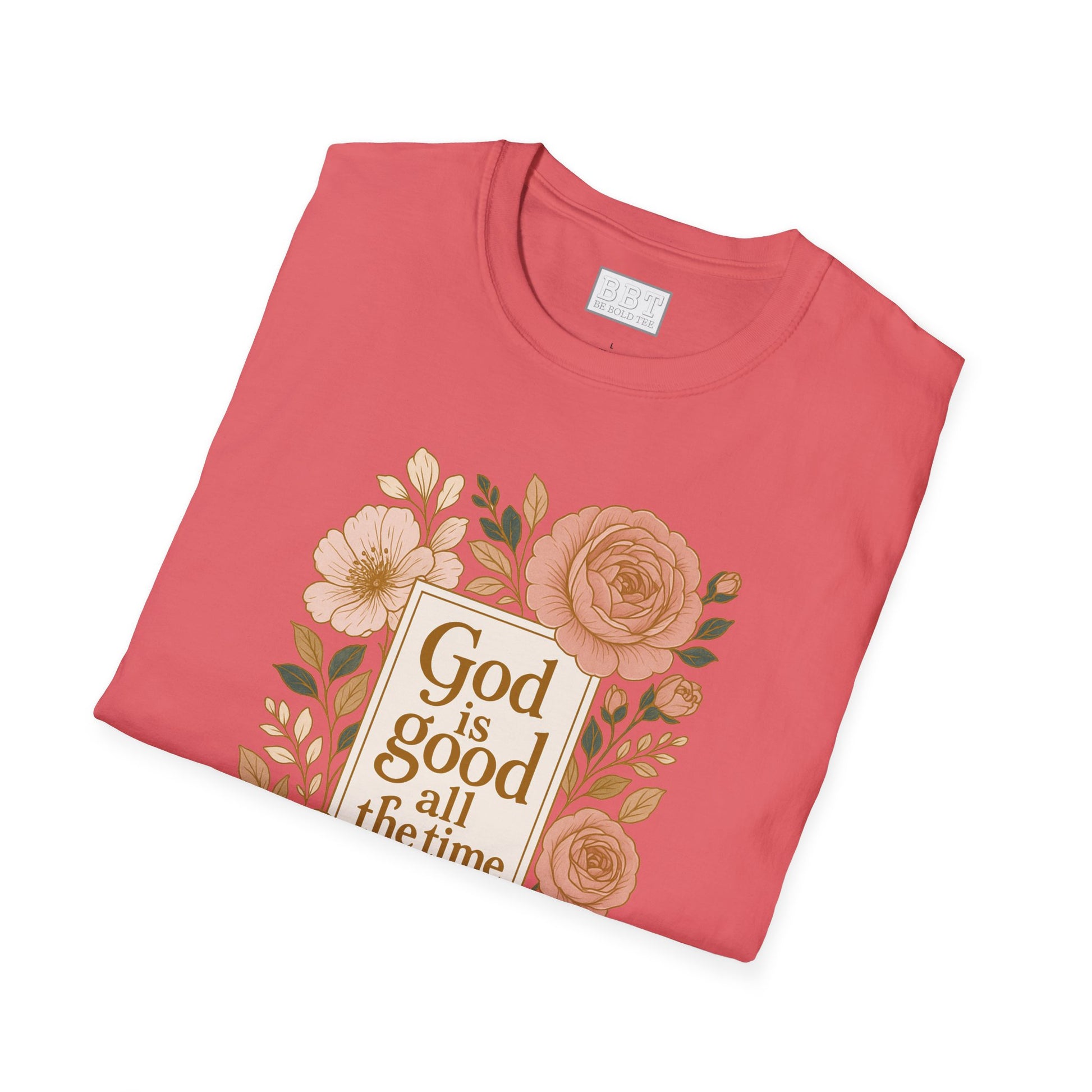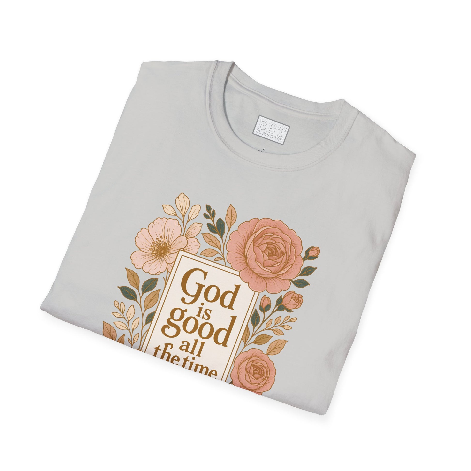 A beautiful rose gold floral tee shirt with the uplifting message 'God is good all the time'. This softstyle unisex t-shirt is made from 100% ring-spun cotton, ensuring durability and smoothness. Perfect for everyday wear and spreading positivity.